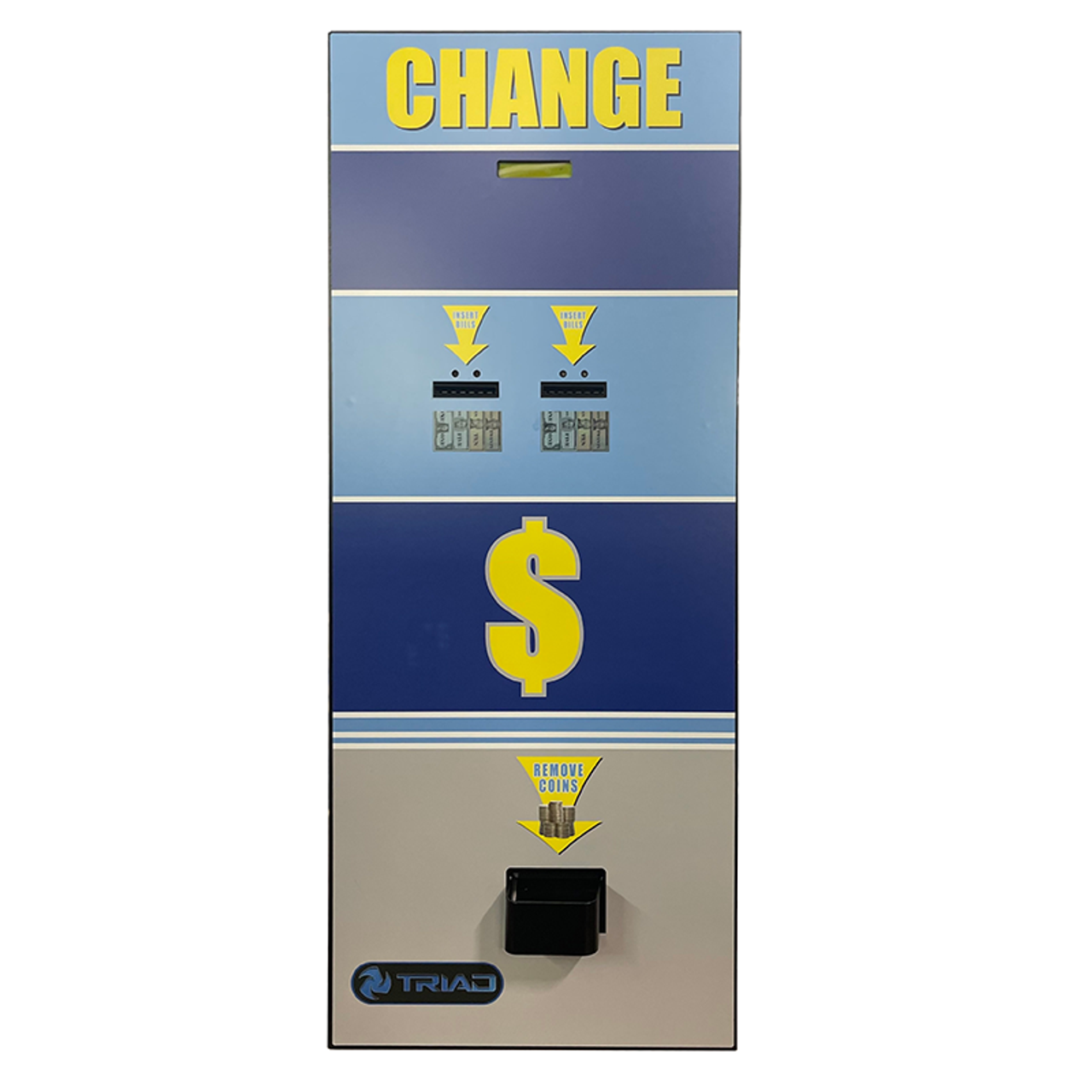 Triad TC 400A-RL1 Rear Load Bill Changer. It includes a Dual CPI Validator with stacker capacity of 500 bills each that accepts $1, $5, $10, and $20 notes. It has two hopper capacities (5600 coins per hopper for a total of 11,200 coins), dual T-Handles, and a user feedback display. It provides on-board audit reports and a re-settable counter. The Triad TC 400A-RL1 Rear Load Bill Changer is a high-quality, heavy-duty industrial grade bill changer.