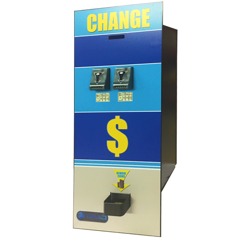 Triad TC 400A-RL4 Rear Load Bill Changer with High Visibility Bezels. It has Dual CPI Recyclers with stacker capacities of 500 bills each that accept $1, $5, $10, and $20 notes. Comes standard with high visibility bezels. It also has dual hopper capacities (5600 coins per hopper for a total of 11,200 coins), dual T-Handles, and a user feedback display. It provides on-board audit reports and a re-settable counter. The Triad TC 400A – RL4 Rear Load Bill Changer is a high-quality, heavy-duty industrial grade bill changer.